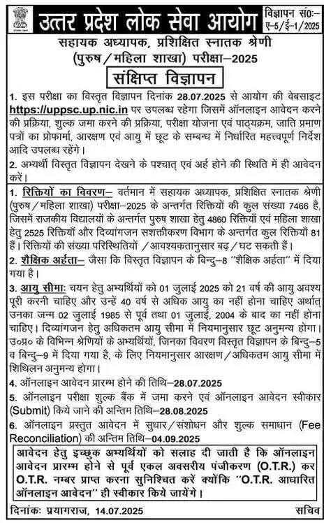 UPPSC (Uttar Pradesh Service Commission) Requirement 2025, Has Been Released Official Notification For UPPSC (Uttar Pradesh Service Commission ) LT Grade Teacher Vacancy 2025 for 7466 Postions. Application Form Will be start From 28 July 2025 The Candidates Apply Late Date 28 August 2025 and Correction Date 04 September 2025, Admit Card 26 November 2025, Exam Date 06,07,21 December 2025, And 17, 18, 24,25 January 2026. The Requirement For UPPSC GIC Teacher LT Grade Age Limits Minimum 21 Years Maximum Age 40 Years As Age On 01 July 2025 All Candidates must be Read Details of Official Website SarkariResult2026 UPPSC GIC LT Grade Teacher Requirements 2025 as Given bellow All Required Links (Advt No. :A-5/E-1/2025)